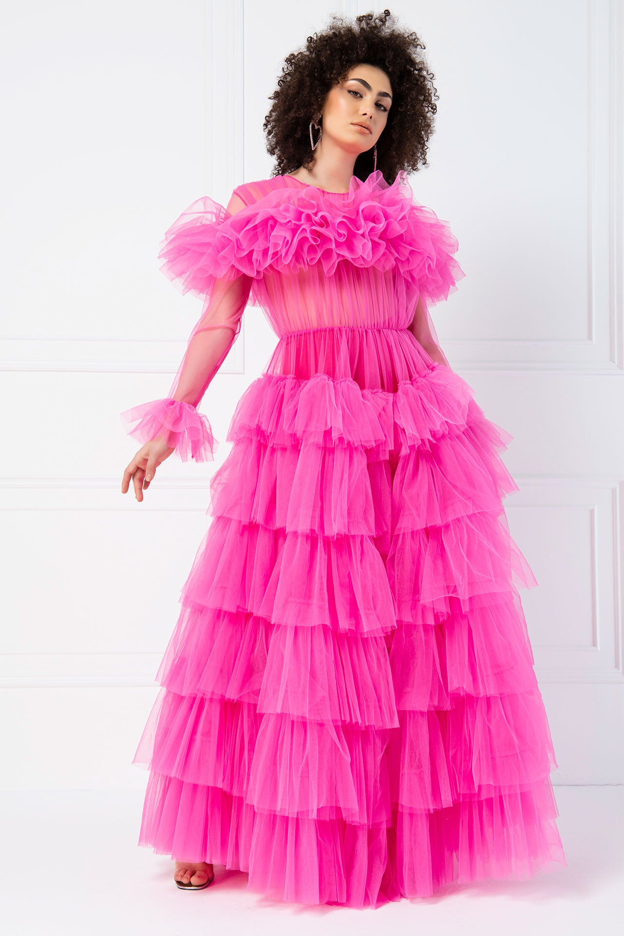 The gown showcases a romantic, off-the-shoulder–inspired ruffle neckline that adds volume and elegance, balanced by delicate long sheer sleeves for a refined finish. Its floor-length silhouette creates graceful drama, perfect for formal occasions where sophistication meets modern couture.