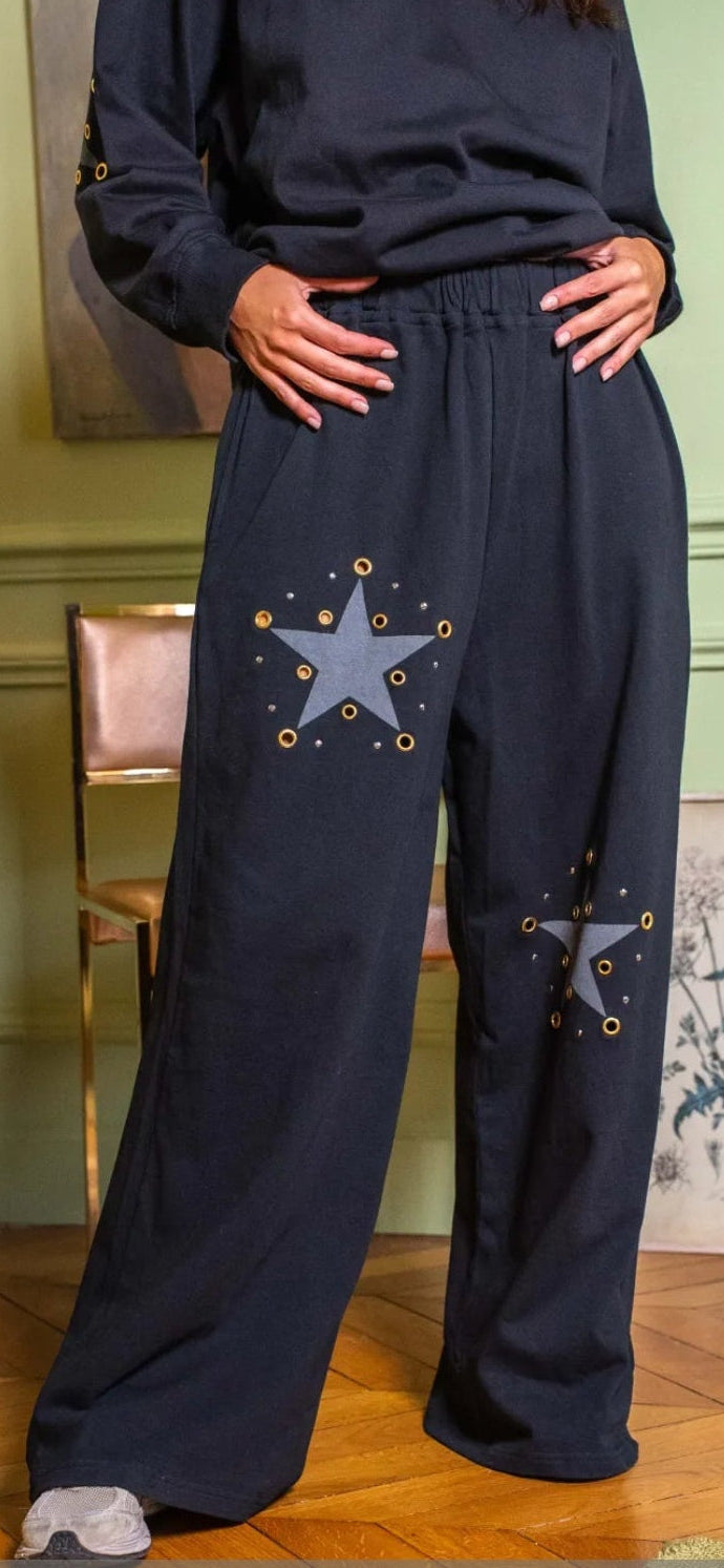 Matching jersey Black pants has same silver star stud accents on the legs.