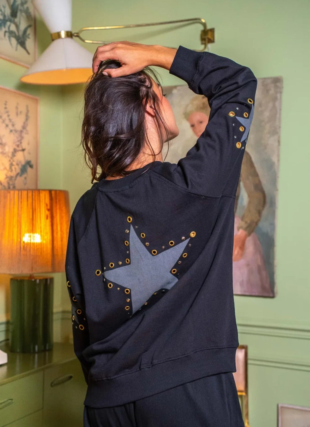 Black jersey cotton oversized knit sweatshirt with big silver star accent on the back and arm with gold studs.
